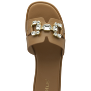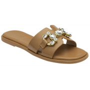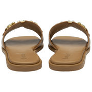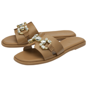 Giving the Lotus Fano sandal a statement finish is the large imitation crystals and the metal hardware that have been encapsulated on the toe strap of this women’s, almost flat, open toe slider. This Lotus tan mule sandal is perfect for sliding on with a wealth of high summer looks.