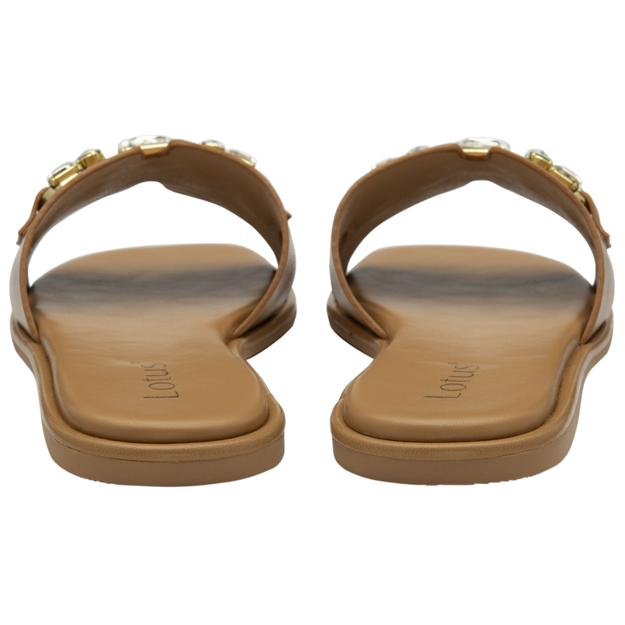 Giving the Lotus Fano sandal a statement finish is the large imitation crystals and the metal hardware that have been encapsulated on the toe strap of this women’s, almost flat, open toe slider. This Lotus tan mule sandal is perfect...